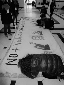 En todo este proceso también se han realizado acciones participativas utilizando como medio las artes plásticas en algunos talleres o, por ejemplo, recuerdo la elaboración de una manta durante uno de los encuentros en el marco del 25 de noviembre sobre la cual, Yolanda Alarcón y yo, estampamos —mediante la elaboración de esténciles— rostros de mujeres y mariposas en alusión a las hermanas Mirabal, para posteriormente invitar a las asistentes a escribir sus pensamientos y demandas contra la violencia hacia las mujeres. El resultado fue una gran manta cargada de significado en la que se hacía presente lo personal y lo colectivo, a partir de la voz escrita de las participantes.